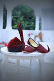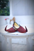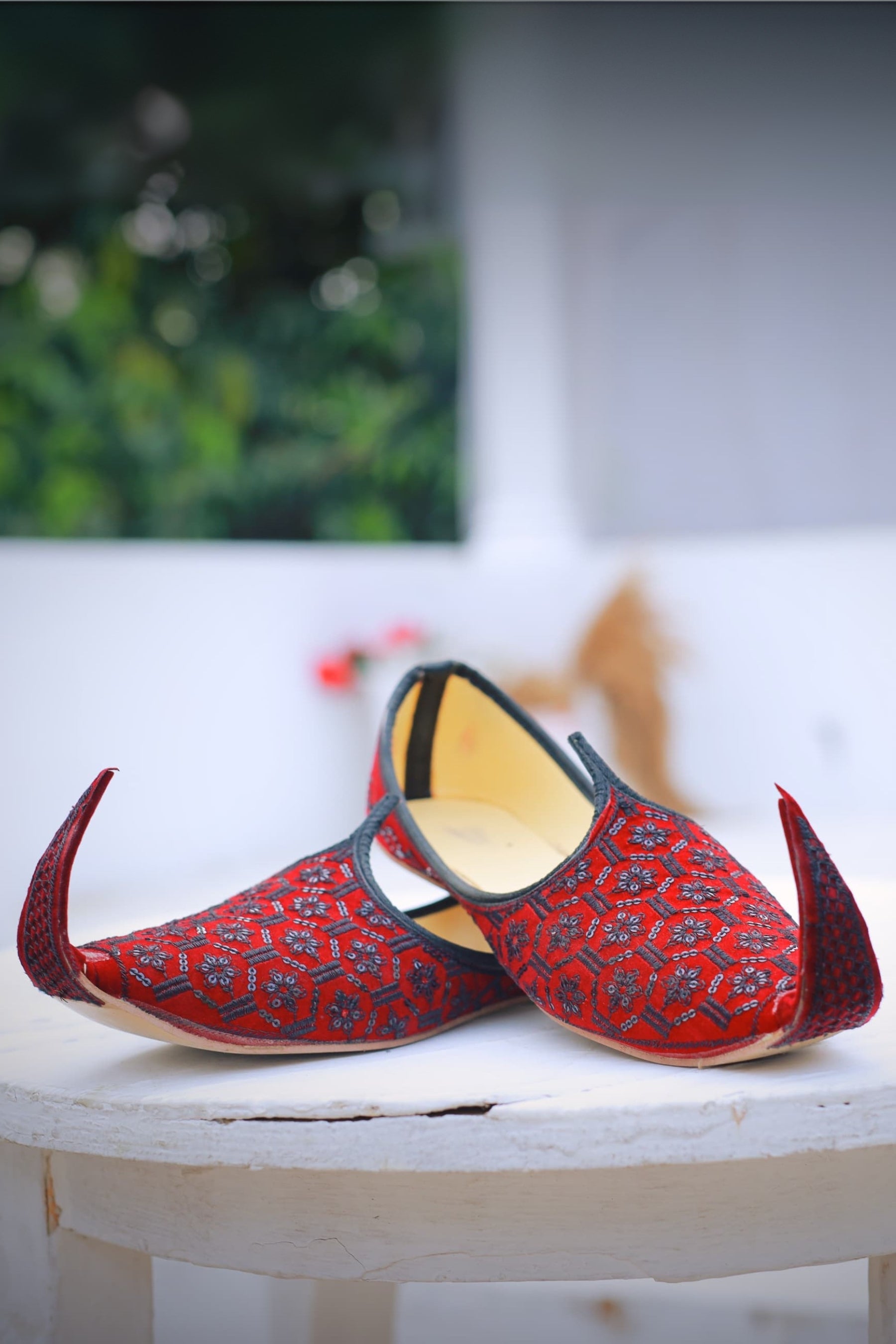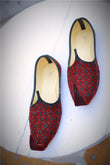This red khussa is hand-embroidered with intricate black thread motifs and subtle sequin accents, set against a classic geometric base. The pointed, upturned toe and contrast edging reflect centuries-old design, while the inner sole is lightly cushioned for all-day wear. Carefully handmade by artisans, this pair blends cultural authenticity with understated charm. Ideal for weddings, festive events, or as a refined touch to traditional wear.