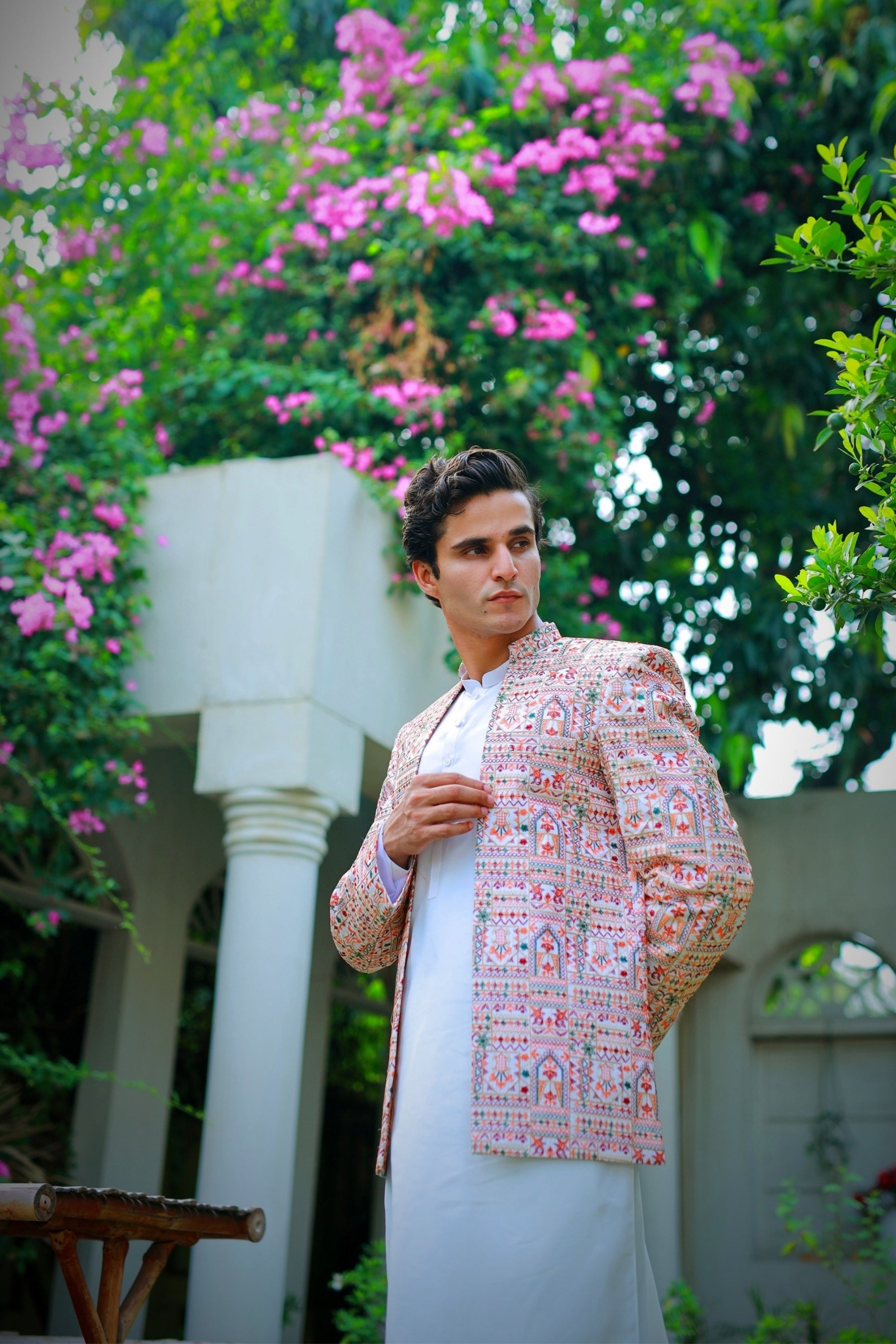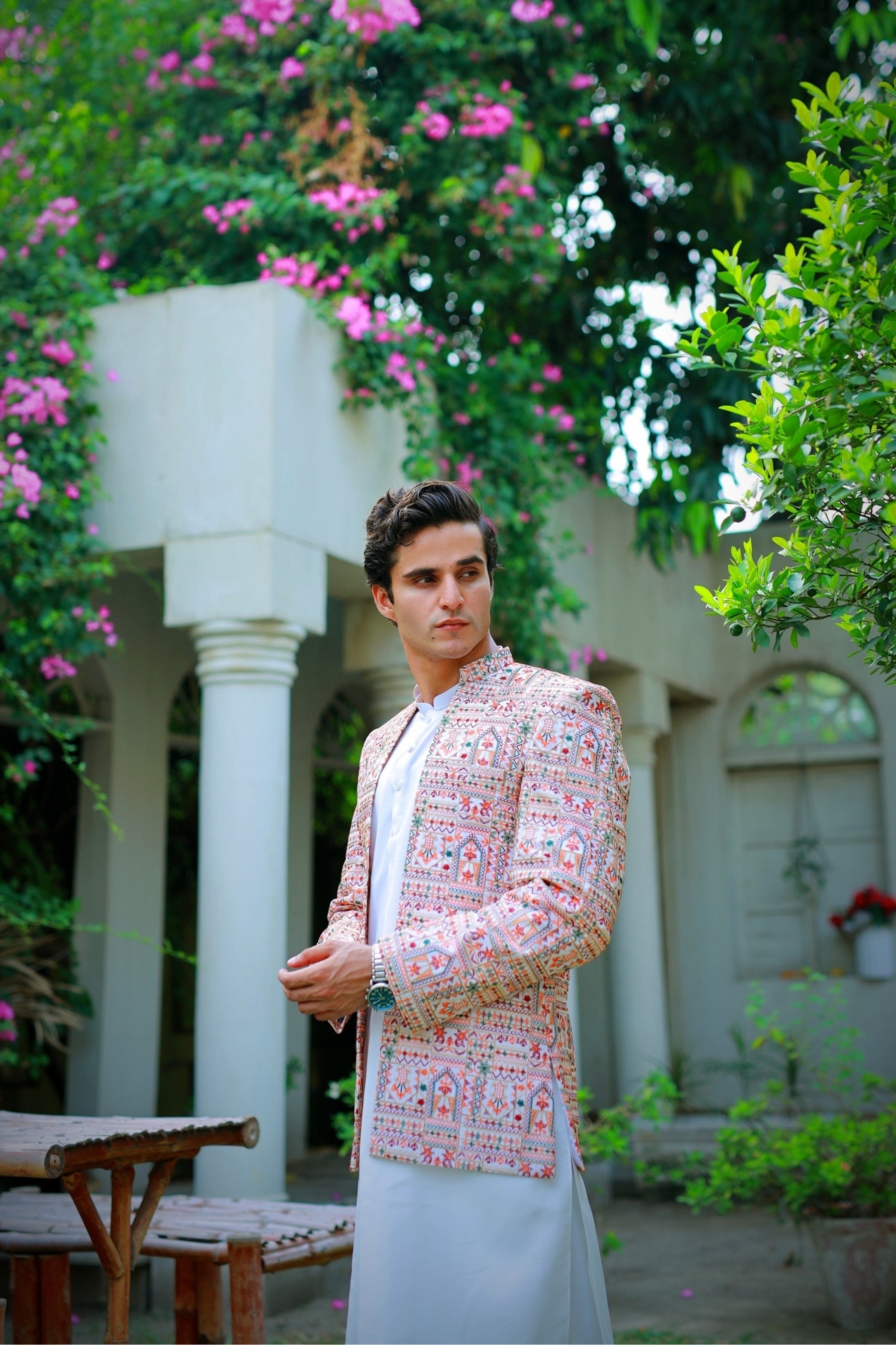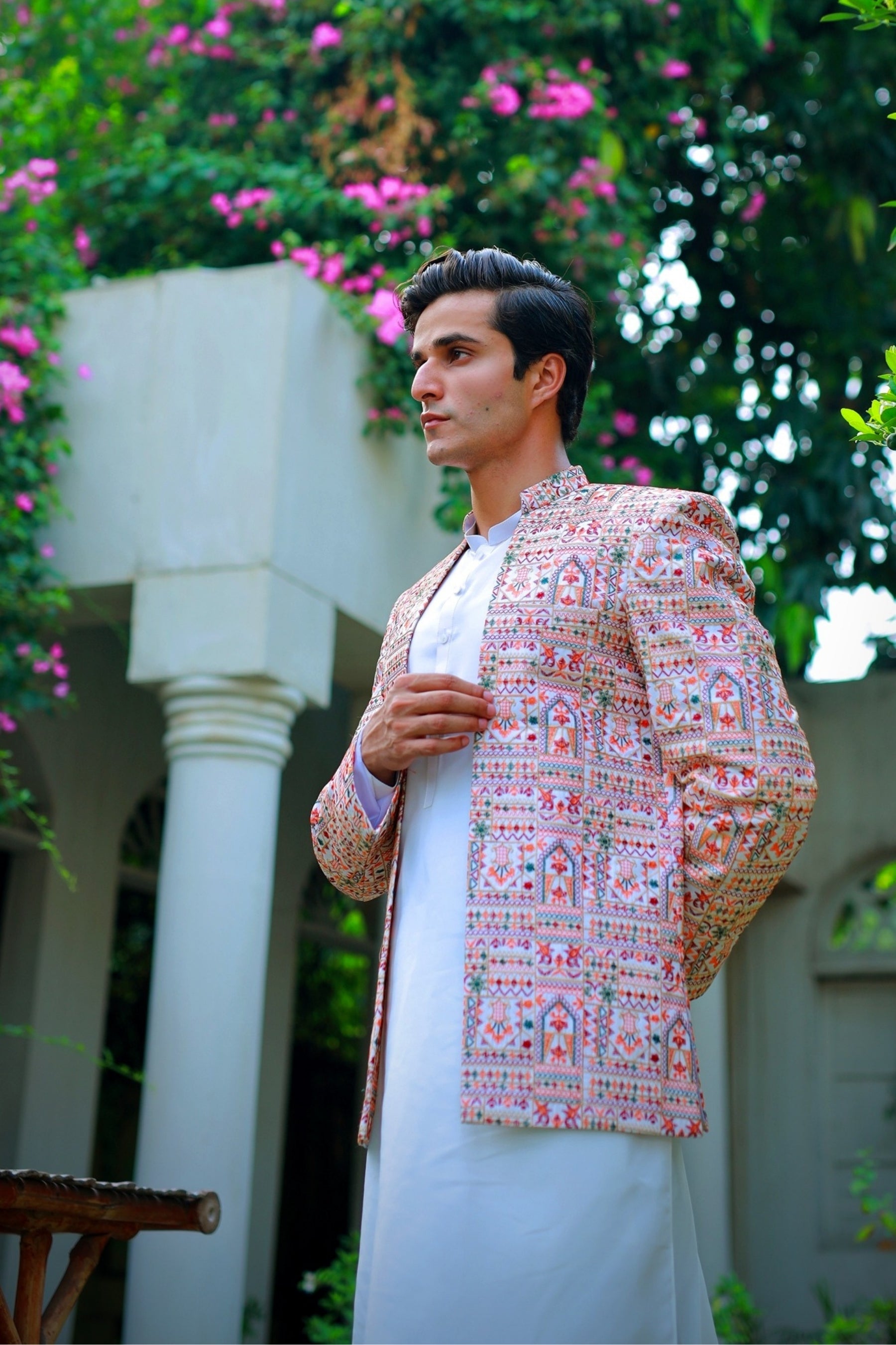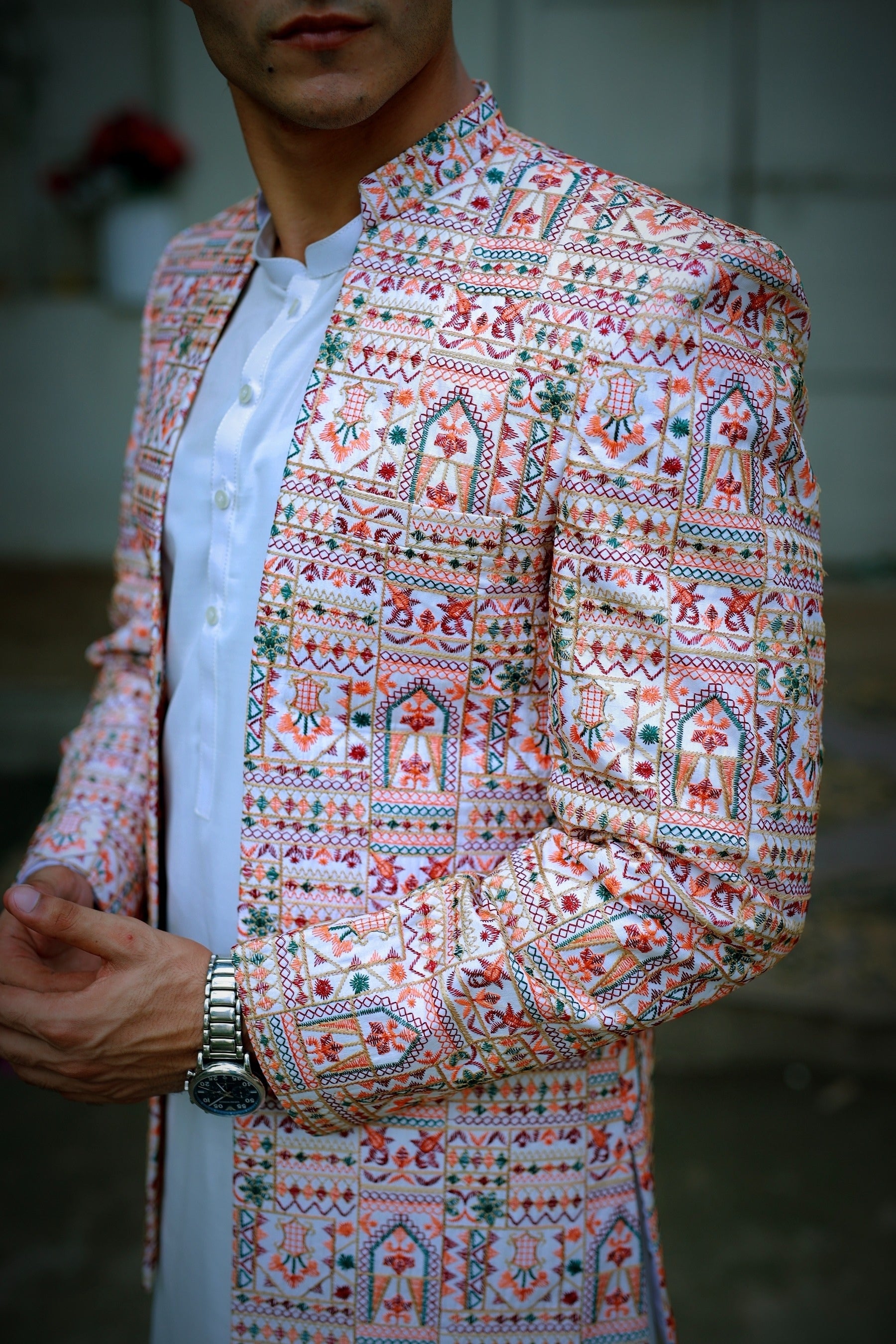 Bring vibrant energy to your look with this eye-catching embroidered prince coat. Made with detailed thread work in vibrant shades, this coat is perfect for weddings, festive events, or any special occasion. It pairs beautifully with a plain white kurta or shalwar kameez, giving you a bold and royal appearance.