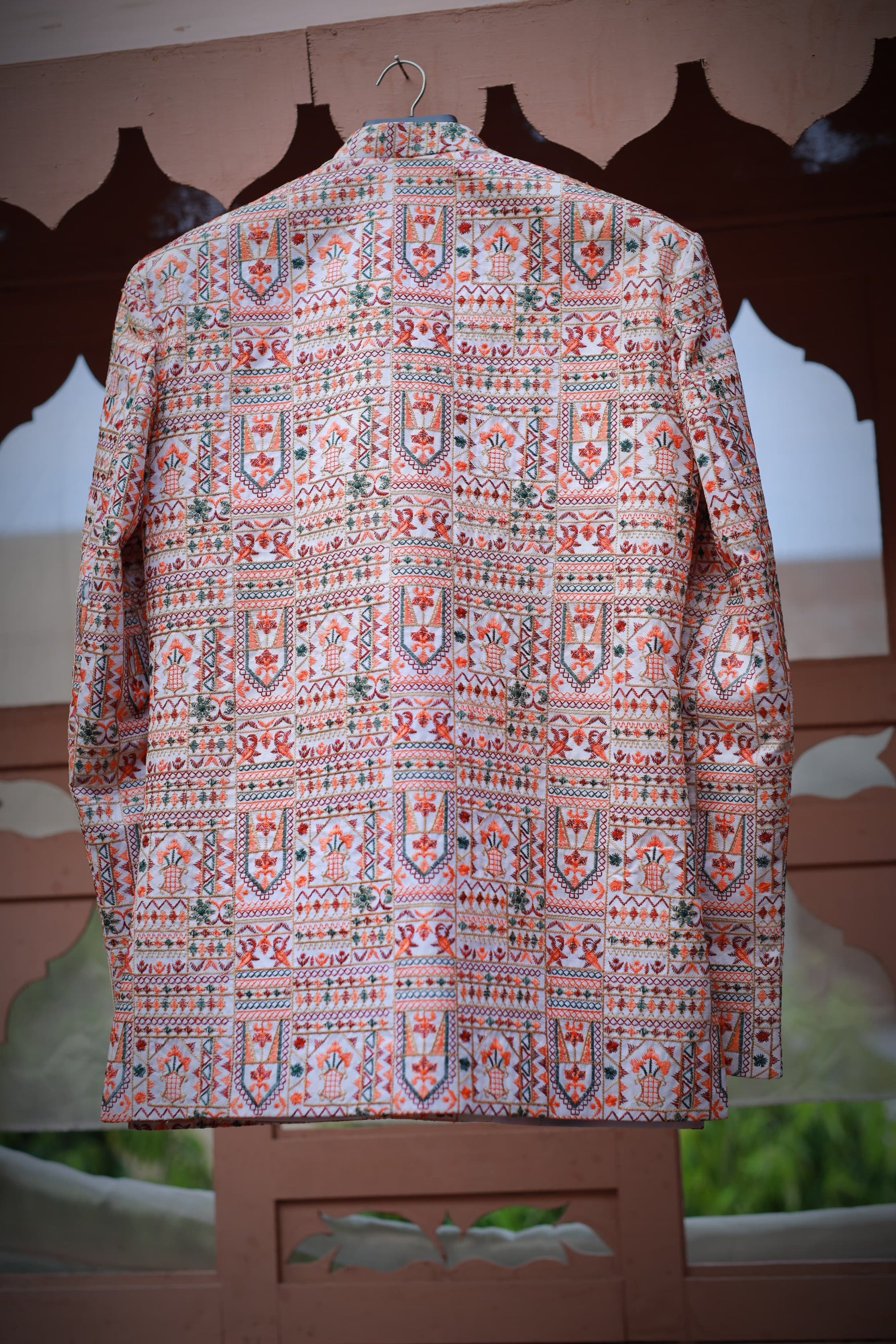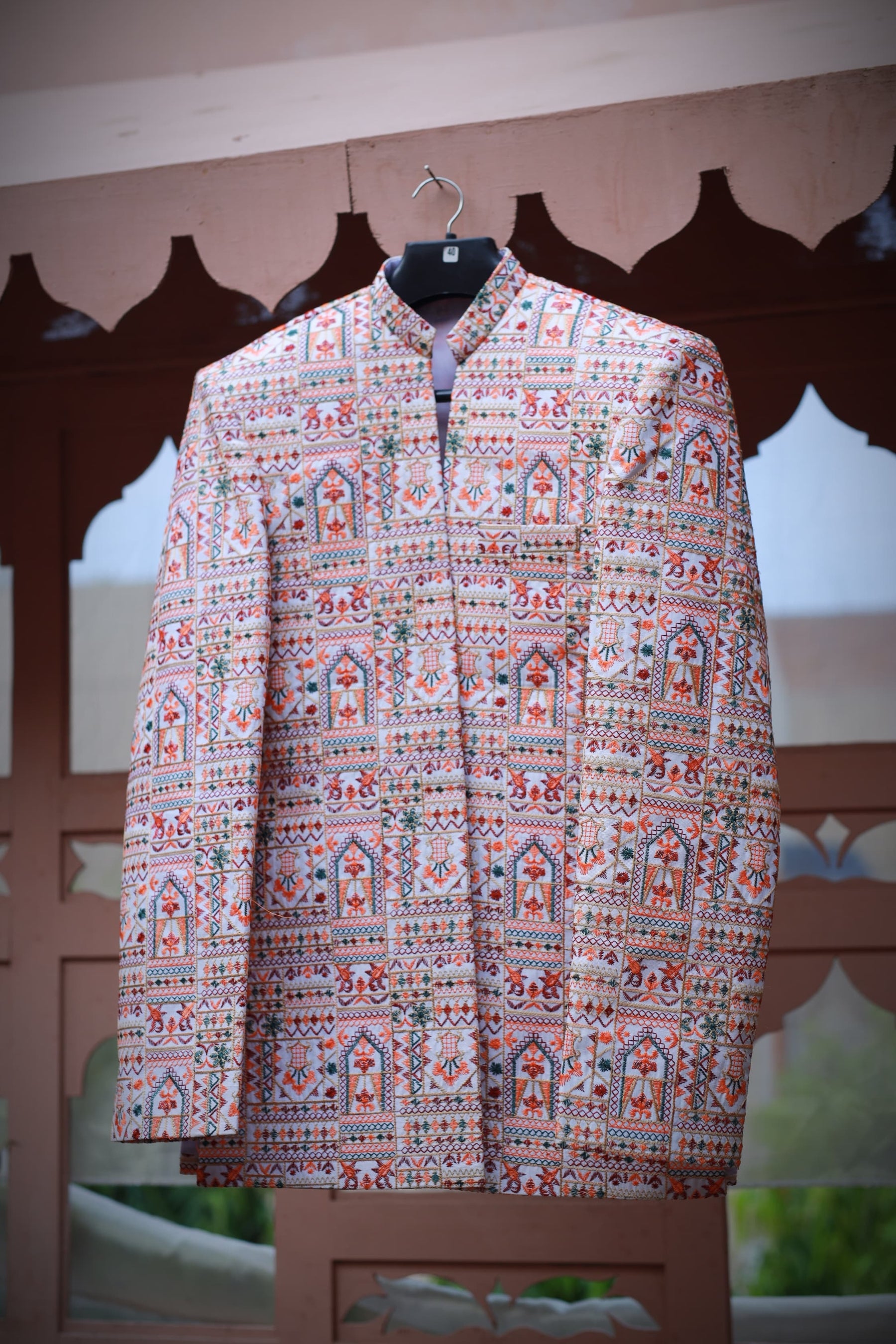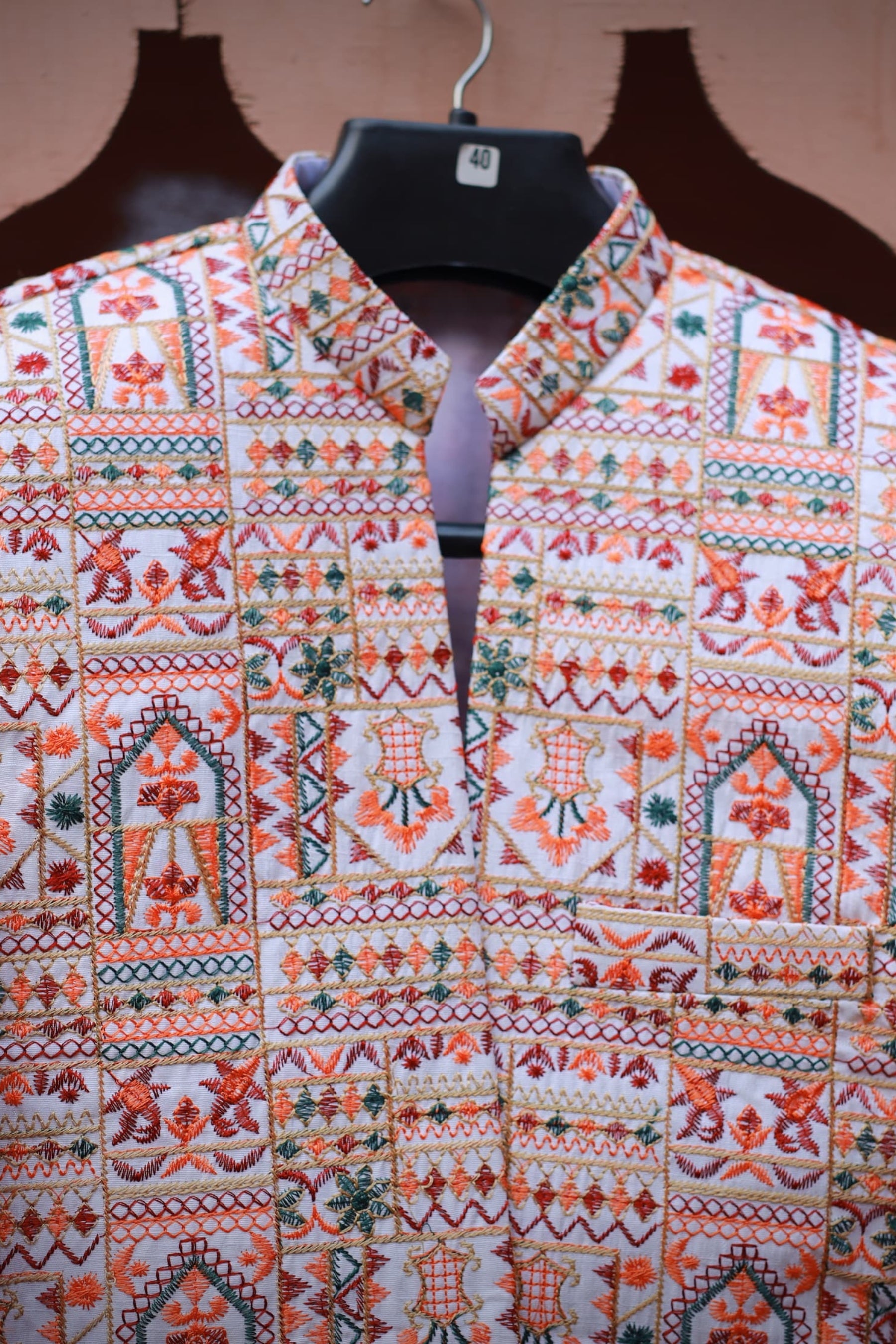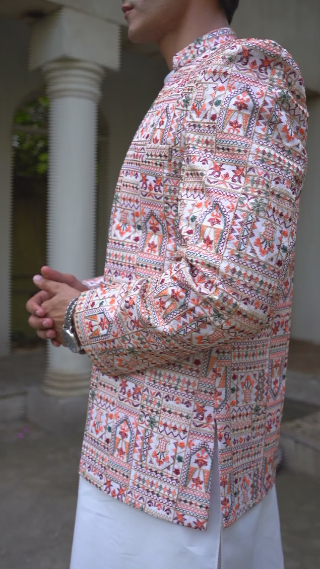 Bring vibrant energy to your look with this eye-catching embroidered prince coat. Made with detailed thread work in vibrant shades, this coat is perfect for weddings, festive events, or any special occasion. It pairs beautifully with a plain white kurta or shalwar kameez, giving you a bold and royal appearance.